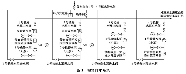 桐柏電站的檢修排水系統(tǒng),共設4臺排水泵,如圖1所示,1號、2號檢修水泵(大泵)用于排空引水隧洞、蝸殼、尾水管、尾水隧洞內(nèi)的水;3號、4號檢修水泵(小泵)用于球閥、上下庫閘門等的滲漏排水。每臺檢修水泵均配置逆止閥、壓力表和帶流量開關的示流信號器,在1號、2號水泵出水管處各安裝了一個流量調(diào)節(jié)閥。系統(tǒng)中共有2根總管,一根為水泵的總吸水管,包括從每臺機組尾水管底部至總管的支管,總吸水管和部分支管及管路上的操作閥門布置在廠房管路廊道中;另一根為總排水管,可將水排至滲漏集水井中,再經(jīng)滲漏排水泵排至下庫。