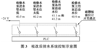它結構是利用旁通管的原理,主導管內(nèi)的液位和尾水管內(nèi)的液位高度一致,根據(jù)阿基米德定理,磁性浮子在液體中產(chǎn)生的浮力和重力平衡,當尾水管中的水位升降時,液位計主導管內(nèi)的浮子也隨之升降,浮子內(nèi)的永久磁鐵通過磁耦合驅(qū)動指示器內(nèi)的翻板指示器,當液位上升或下降時,翻板指示器由白色翻轉為紅色,或由原來的紅色翻轉為白色,指示器的顏色改變的高度就是被測水位的實際高度,從而實現(xiàn)液位的現(xiàn)場指示,以供運行人員目測尾水管的實時水位。安裝于液位計管壁外側的磁記憶開關,可多點設置、滑動調(diào)整位置,提供了液位開關量報警功能。在裝置的頂部安裝了一個自動排氣裝置,當主導管內(nèi)液位上升時能夠自動的排氣,下降時能夠按時補氣。現(xiàn)場安裝頂裝式磁翻板液位計時,裝置標尺的0位,對應的實地高程為EL.40.0m。浮子開關設定5個水位動作值,檢修水位低開關量報警值對應的高程為40.3m;停止所有檢修水泵的開關量,所對應的高程為40.5m;啟動主用檢修水泵的開關量,所對應的高程為40.9m;啟動檢修水泵主用泵的開關量,以及要求手動啟動大泵,并作為水位高報警上送上位機,所對應的高程為41.1m與41.2m,兩個開關量并列接入。全部開關量分別送入PLC,如圖3所示。