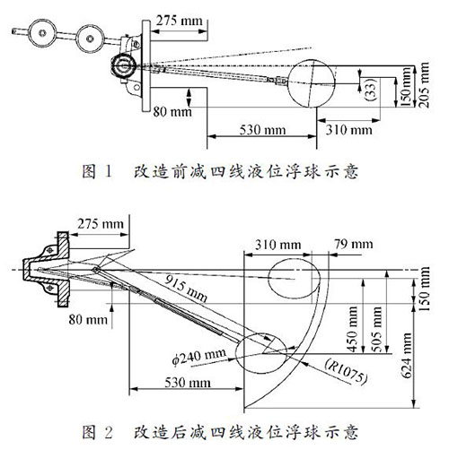 針對減四線液位測量進行大轉角、切割集油箱改造,有效量程大于設計量程的80%,其改造測繪圖如圖2所示。改造后,安裝支架120 mm,插入深度為1 155mm,實際測量液位達450mm,儀表接液部位全部選用317材質。轉軸—杠桿套筒、杠桿套筒—連桿、浮球—連桿的固定連接節點及加工焊接坡口增加焊接強度;對于活動節點,采用專用銷子固定。