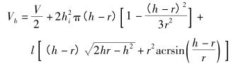 根據(jù)質(zhì)量計算公式m=QV可知,需能找到不同液位H下對應(yīng)的體積V,然后乘以溫度修正過的液氨密度Q液氨,即得出準(zhǔn)確的氨罐噸位。通過查閱相關(guān)資料,臥式氨罐體積V與高度H可用下式進行計算: