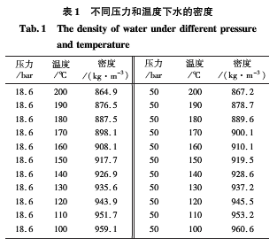 在實(shí)際過程中,加熱器中不同位置的水溫是不一致的,它和加熱器的形狀、體積等條件有關(guān),同理在測量通道中不同位置的水溫也是不一致的。這會對理論計算造成較大的困難,在此對容器中水的溫度分布做了簡化。如圖1所示,在閥門V的左端為加熱器的水溫,假設(shè)水溫一致,且都為T1,在閥門V的右端為測量通道的水溫,設(shè)水溫一致,且都為T2。在加熱器額定工作壓力P的情形下,T1溫度和T2溫度下對應(yīng)的水的密度分別為ρ1和ρ2。在閥門V處,左端的壓力等于右端的壓力,由此可得: