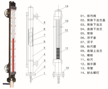 根據浮力原理,浮子在測量管內隨液位的升降而上、下移動,浮子內的永久磁鋼通過耦合作用,驅動紅、白色翻柱翻轉180°,液位上升時翻柱由白色轉為紅色,下降時由紅色轉為白色,從而實現液位指示。