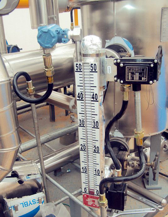 鑒于潤滑油液位計具有被測介質與指示機構完全隔離,密封性能好,防泄漏、適應腐蝕條件下的液位測量等優點,且可靠性高、耐振性能好、結構簡單、安裝方便、維護費用低,現已在電力、石油、化工、冶金、環保、船舶、建筑、食品等行業得到廣泛應用。本公司用戶上海某公司帶熱壓縮器低溫多效蒸餾海水淡化的濃鹽水、蒸餾水及冷凝水液位測量都采用帶遠傳的潤滑油液位計。為了防止結垢,需在低溫的情況下讓海水達到沸點,要求海水淡化裝置內部處于負壓狀態,正常運行時為-0.093MPa左右,此為用戶潤滑油液位計使用須達到的工藝要求,以下說明即為儀表在負壓狀態下發生管路漏氣的典型故障分析情況。