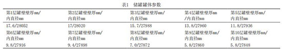 (1)改造前對(duì)儲(chǔ)罐的罐體進(jìn)行了超聲波測(cè)厚以及材料的化學(xué)成分及性能分析,其材質(zhì)滿足現(xiàn)行的使用條件,其儲(chǔ)罐的罐體參數(shù)及每層罐壁的厚度(實(shí)測(cè))見表1,罐壁的每層壁板高度為1690mm,其搭接寬度為40mm,縱焊縫為對(duì)接結(jié)構(gòu),見表1。