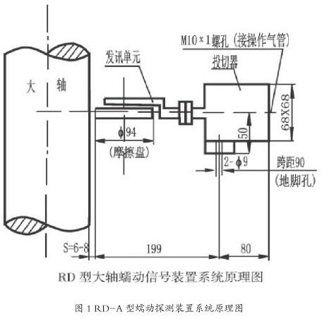 該電站蠕動探測之前主要使用的是氣動式機械蠕動裝置和電動式機械蠕動裝置,哈電機組和 VHS 機組使用的是氣動式蠕動裝置,型號為 RD-A 哈控,RD-A 型蠕動探測裝置由投切器和發(fā)訊單元兩部分組成,當機組停機完成后通過蠕動控制電磁閥(空氣電磁閥)向投切器通入壓縮空氣,它將發(fā)訊單元向前推進,使其磨擦盤與機組大軸表面相接觸(有稍許正壓力)。如果大軸發(fā)生蠕動,轉角達到 1.5° ~2°時,發(fā)訊單元便發(fā)出大軸蠕動信號,作用于報警與制動回路,投入制動閘以防蠕動現(xiàn)象擴延。機組起動前,先動作空氣電磁閥使投切器排氣,由于彈簧力的作用,發(fā)訊單元退回原位。離開大軸表面 6 mm~8 mm,確保裝置安全。RD-A型蠕動探測裝置系統(tǒng)原理如圖1所示。RD-A型探測裝置易卡澀導致探測裝置投退失敗,影響開停機成功率。東電機組使用的是電動式蠕動裝置,型號為 PXJ-1D。PXJ-1D 型蠕動探測裝置多起反饋信號拒動的事件,導致開停機流程退出,其原因為電動式蠕動裝置控制回路與位置反饋節(jié)點取自同一個行程開關,當行程開關常閉節(jié)點斷開時,電機停止轉動,而此時可能因行程過短導致常開節(jié)點尚未閉合,位置信號無法正常上送至監(jiān)控系統(tǒng)。為了解決這一問題,目前電站 15 臺機組蠕動探測裝置已換型為非接觸式蠕動探測裝置,避免開停機過程中投入或退出蠕動失敗導致的流程退出。非接觸式蠕動探測裝置設計原理為 :