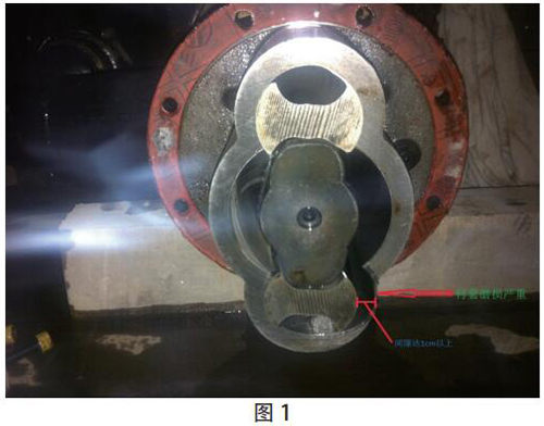 2015 年 8 月 10 日 17:50 機(jī)組在運(yùn)行過(guò)程中“機(jī)組高位油箱事故低油位動(dòng)作”事故停機(jī)。現(xiàn)場(chǎng)檢查發(fā)現(xiàn)機(jī)組高位油箱油位為 60mm,低于下限值 90mm。進(jìn)一步檢查發(fā)現(xiàn),稀油站 2# 低壓油泵空轉(zhuǎn),沒(méi)有打油,振動(dòng)、聲音較大。18:18 維護(hù)人員對(duì) 2# 低壓油泵進(jìn)行了搶修拆解。發(fā)現(xiàn)油泵從動(dòng)螺桿與襯套間隙過(guò)大,達(dá) 1cm 以上,襯套磨損嚴(yán)重(見(jiàn)圖 1)。油泵損壞,無(wú)法打油。