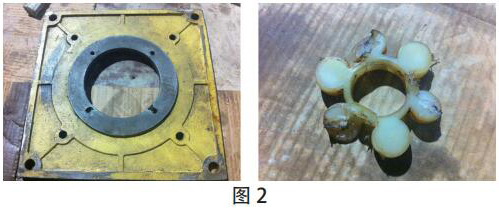 2015 年 9 月 23 日運(yùn)行過(guò)程中,02:15 因“機(jī)組高位油箱低油位動(dòng)作”停機(jī)。現(xiàn)場(chǎng)拆解稀油站 1# 低壓油泵,發(fā)現(xiàn)油泵與底座 2 顆連接螺栓脫落、出油管松脫、底座螺孔拉崩、螺孔周圍多處裂紋、緩沖墊破損等諸多問(wèn)題。造成油泵無(wú)法供油,引起停機(jī)。如圖 2 所示。