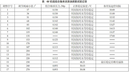 (4)方案四:調(diào)整組合軸承潤(rùn)滑油量經(jīng)過(guò)主機(jī)制造廠設(shè)計(jì)部計(jì)算復(fù)核,認(rèn)為現(xiàn)有油泵有可能滿足冷卻要求。經(jīng)過(guò)與電廠溝通,聯(lián)合制定了減少組合軸承用油量的試驗(yàn)方案。主要措施為:在組合軸承供油管調(diào)節(jié)閥后組合軸承前增加一壓力表,用于監(jiān)視組合軸承供油壓力。機(jī)組在滿負(fù)荷運(yùn)行條件下,分階段逐步調(diào)整節(jié)流閥減少供油量,監(jiān)視記錄組合軸承供油壓力和組合軸承溫度,直到單臺(tái)油泵滿足用油量略有余量、備用泵處于備用狀態(tài)下,正向推力瓦*高溫度控制 55℃以內(nèi)。*后恢復(fù)單冷卻器運(yùn)行和環(huán)境溫度*高條件下檢驗(yàn)軸承溫度。