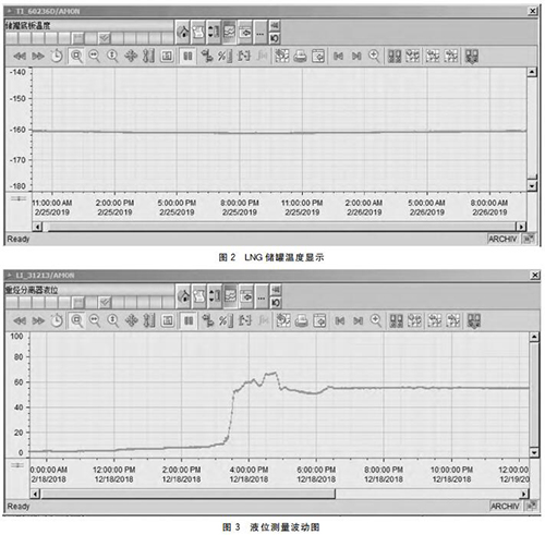 然后利用多孔法蘭(結合LNG項目的實際情況來選擇法蘭的孔數(shù)以及尺寸大小),將其接到LNG罐頂?shù)臏囟茸兯推鹘泳€箱內部,再使用多芯電纜把4~20mA信號發(fā)送到控制系統(tǒng)。現(xiàn)場安裝RTD熱電阻建議選用雙支,方便以后檢修更換。圖2為LNG儲罐溫度顯示。