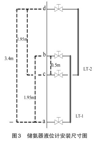 如圖3將LT-1液位計的總高度1.95m,占儲氨罐 a 點到 d 點 3.4m 的 57%;而 LT-2 液位計的總高度1.95m,占儲氨罐a到d點3.4m的57%;所以要將軟件數據庫內的量程值對應修改為:LT1量程下限:0%、量程上限 57%;LT2 量程下限:0%、量程上限57%。