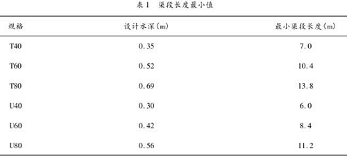 根據(jù)《灌溉渠道系統(tǒng)量水規(guī)范》(GB/T 21303 -2007),設置標準斷面的渠段長度,應大于 20 倍*大水深。定型斷面量水渠槽的渠段長度如表 1 所示。