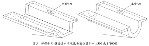 為便于直接確定渠道比降,定型斷面在工廠制作時,在渠道堤頂安裝水準氣泡,當水準氣泡居中時,設定的定型渠道斷面比降即為 1/500 或 1/1000時,不需再進行渠槽斷面參數(shù)的現(xiàn)場率定,通過量測定型斷面渠道水深,即可求得過水流量。圖 5 為設置水準氣泡的梯形渠道定型斷面和 U 型渠道定型斷面示意圖。