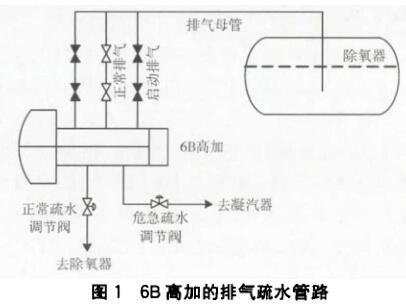 6B高壓加熱器設有2路啟動排氣和1路正常排氣,3路排氣管道匯至1根管道進人除氧器并插人除氧器正常液面以下,如圖1所示。啟動階段高壓加熱器啟動排氣閥門和正常排氣閥門均開啟排氣,正常運行時啟動排氣閥關閉,正常排氣閥開啟。排氣管線從7.5 m平臺經過多次折向匯集到23 m排氣母管,然后再引人除氧器,這導致排氣管線存有蒸汽冷凝水;由于在排氣管線上存有一定的冷凝水,啟動排氣閥開啟后,存在于排氣管道的冷凝水依靠重力排至高壓加熱器汽側,在啟動排氣管至除氧器的管路中形成一定的真空,從而產生虹吸作用,使除氧器的水吸人6B高壓加熱器,導致B側高壓加熱器液位異常升高而發生解列。