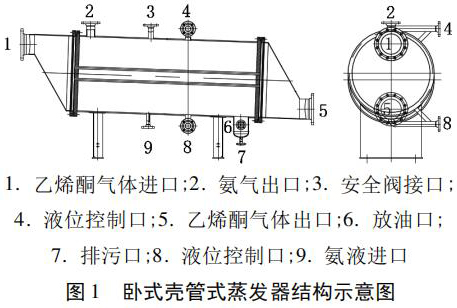 廣西某化工實(shí)業(yè)有限公司購(gòu)進(jìn)了四臺(tái)靖江容器制造有限公司生產(chǎn)的換熱面積為 26. 3 m3 的臥式殼管式蒸發(fā)器,廠家提供的結(jié)構(gòu)示意圖見圖 1,主要用于冷卻乙烯酮?dú)怏w,要求四臺(tái)臥式殼管式蒸發(fā)器出口的乙烯酮?dú)怏w溫度依次為 - 5℃、- 10℃、- 15℃、 - 20℃,以分離出乙烯酮?dú)怏w中的水和醋酸,并防止結(jié)冰。