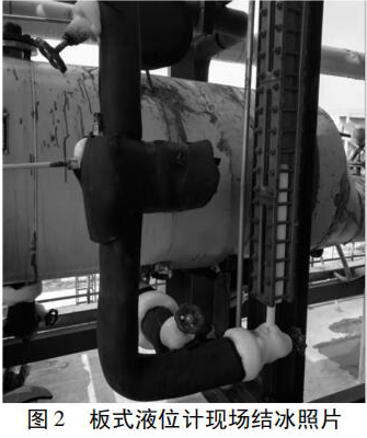 制冷系統(tǒng)調(diào)試運(yùn)行時(shí),發(fā)現(xiàn)防霜磁翻板液位計(jì)的底部開始有氨氣泡形成,徐徐上升到液面消失,并且液面上下浮動(dòng),幅度較大,不能穩(wěn)定在某一位置內(nèi)。隨著系統(tǒng)的運(yùn)行,液位計(jì)的下部開始結(jié)露、結(jié)霜,結(jié)霜高度逐漸增加,并由霜轉(zhuǎn)化為冰,無法觀察到液位,見圖 2。同時(shí),螺桿式制冷壓縮機(jī)出現(xiàn)了“潮車”現(xiàn)象。由于操作者無法判斷液位的準(zhǔn)確位置,為防止事故發(fā)生,被迫停機(jī),嚴(yán)重影響了物料的生產(chǎn)。