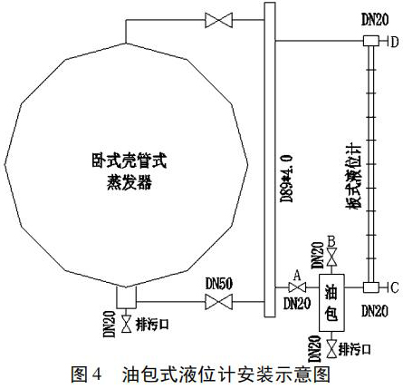 3. 安裝油包式液位計(jì)。根據(jù)現(xiàn)場(chǎng)的臥式殼管式蒸發(fā)器的實(shí)際情況,繪制了油包式液位計(jì)安裝示意圖( 圖 4) ,在排污口通向大氣、安全員現(xiàn)場(chǎng)監(jiān)督的情況下,實(shí)施焊接、安裝。