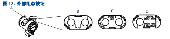 使用位于頂部銘*下、三組可能的外部組態(tài)按鈕中某一組進行零點調校。為了操作組態(tài)按鈕,需要松開螺釘,滑動變送器頂部的銘*。參照圖 10 來確認功能。