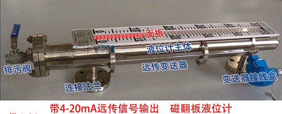 防凍液液位計測量液體時采用頂裝或旁通管側裝方式。磁翻柱主體外加裝翻柱液位指示器、液位開關及液位變送器。磁單元置于浮球內部或通過頂桿與浮球相連,當浮球連帶磁單 元隨液位變化時,使磁性色塊(磁翻板)翻轉;磁性液位開關在對應液位點動作;同時液位傳感器在浮球磁力的作用下,輸出標準的變化電阻信號,再經過變送器把電阻信號轉換 成4~20mA電流信號輸出。