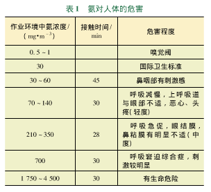 氨氣是一種無色透明而具有刺激性氣味的氣體,*易溶于水成為氨水(又稱氫氧化銨),呈弱堿性,1%水溶液pH值11.7。氨易液化,經壓縮后成為液氨。根據衛法監發(2003)142號《高毒物品目錄》,氨氣屬于2.3類高毒氣體,8類腐蝕品,火災爆炸危險性類別為乙A類。氨與空氣混合到一定比例時,遇明火能引起爆炸,其爆炸*限(體積分數)為15.5%~25%。低濃度氨對粘膜有刺激作用。高濃度氨可引起組織溶解性壞死、皮膚及上呼吸道粘膜化學性炎癥及燒傷、肺充血、肺水腫及出血等。常易發生輕度、重度中毒。外露皮膚可出現II度化學灼傷。氨對人體的危害見表1。